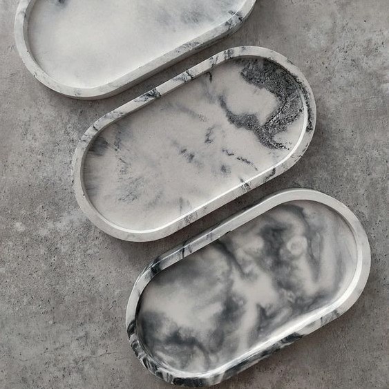 Bandejas 100% artesanais feitas de concreto branco e preto.