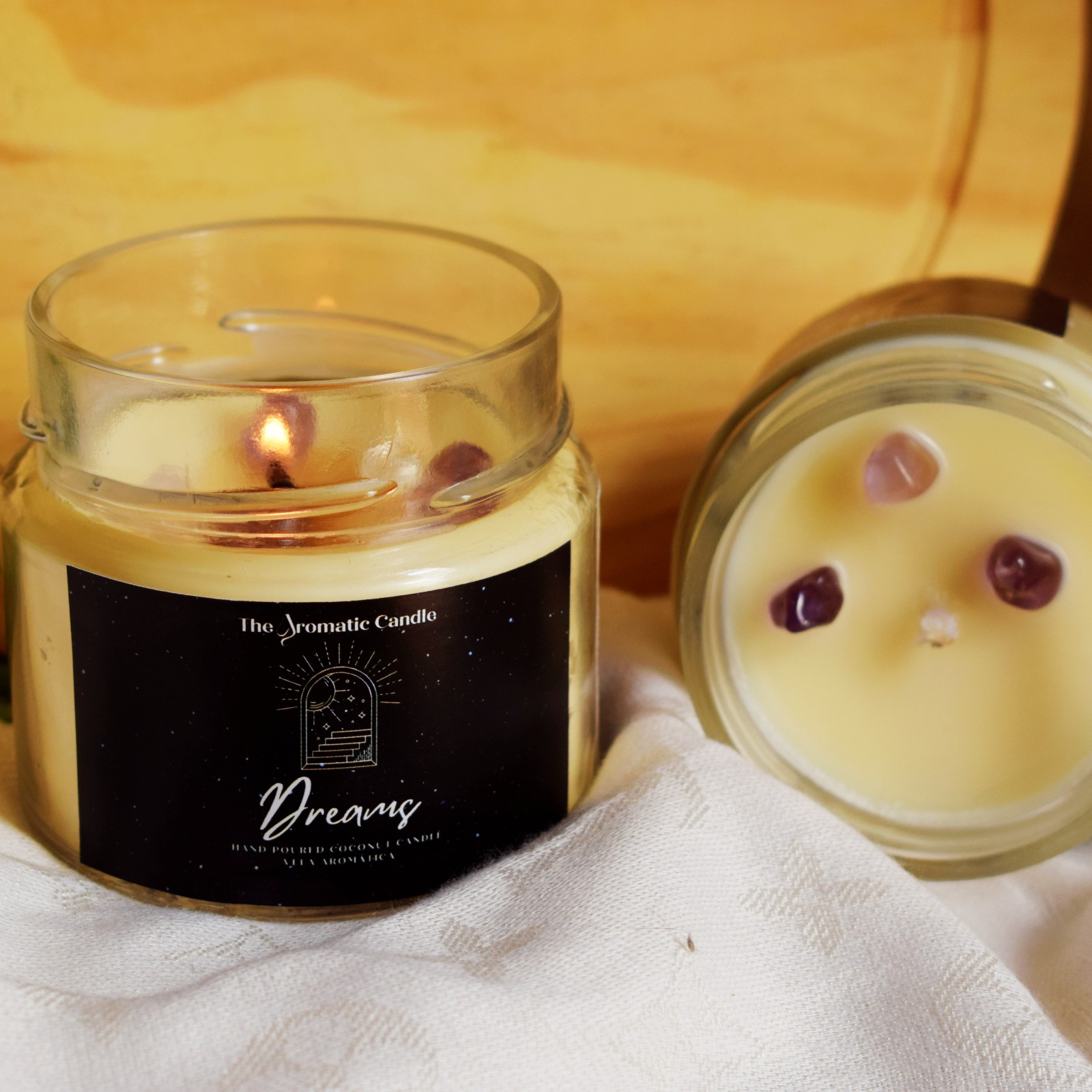 A Vela Dreams vem com pedras Ametistas que acalmam, purificam e ajudam na melhora psíquica no combate à insônia, trazendo paz e tranquilidade.