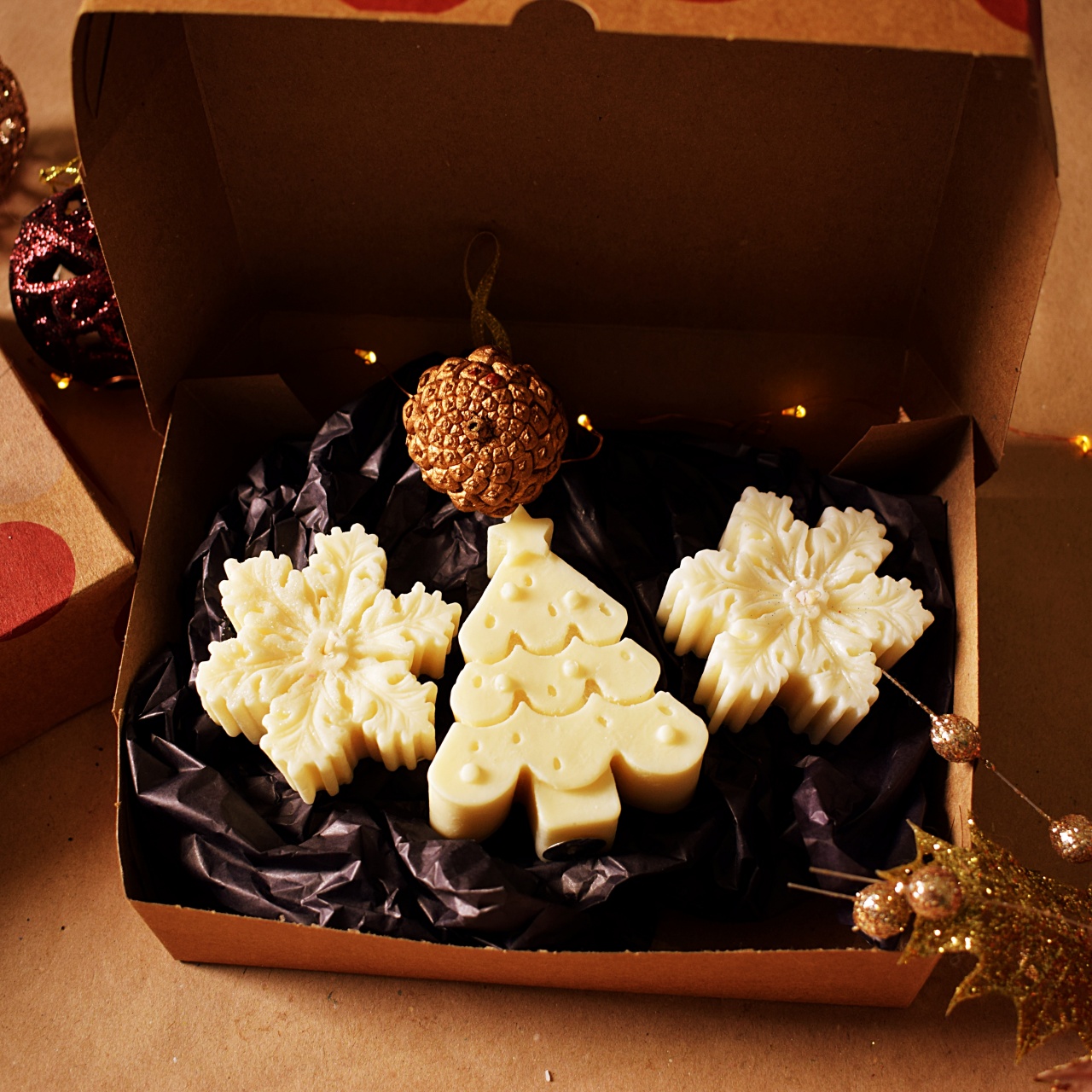 Composto por duas velas floco de Neve e uma árvore de natal ele ainda vai com uma caixa de presente linda!