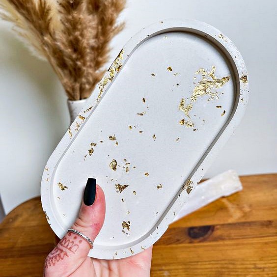 Bandejas 100% artesanais feitas de concreto e delicadas folhas de ouro.