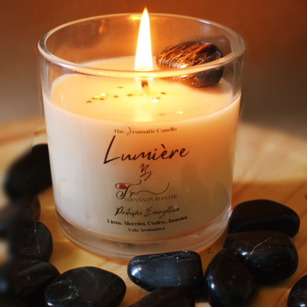 Além disso, a Vela Lumière é enriquecida com a presença reconfortante da pedra turmalina negra. Conhecida por suas propriedades de proteção e purificação, a turmalina negra atua como guardiã, dissipando energias negativas e proporcionando um refúgio de serenidade e equilíbrio.